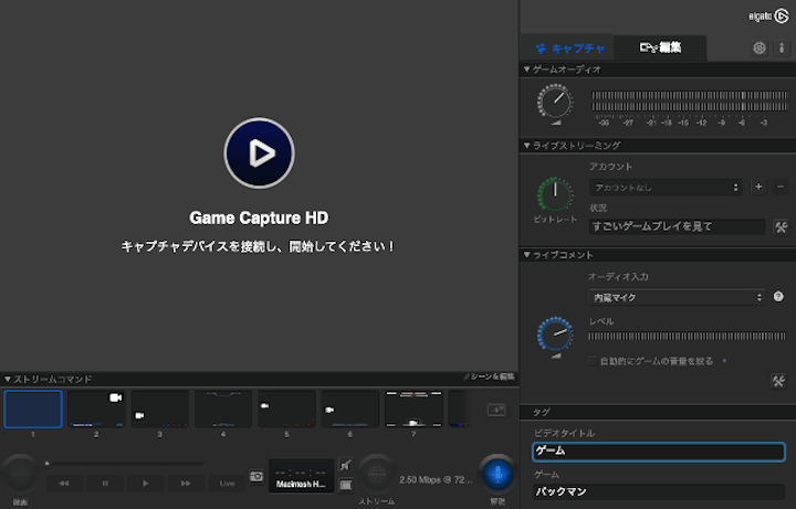 Elgato Game Captureを起動すると、デフォルトの画面は以下のようになっています。(※macOSの場合)
