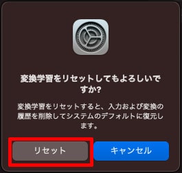 「変換学習をリセットしてもよろしいですか?」という確認メッセージが表示されるので「リセット」を選択します。