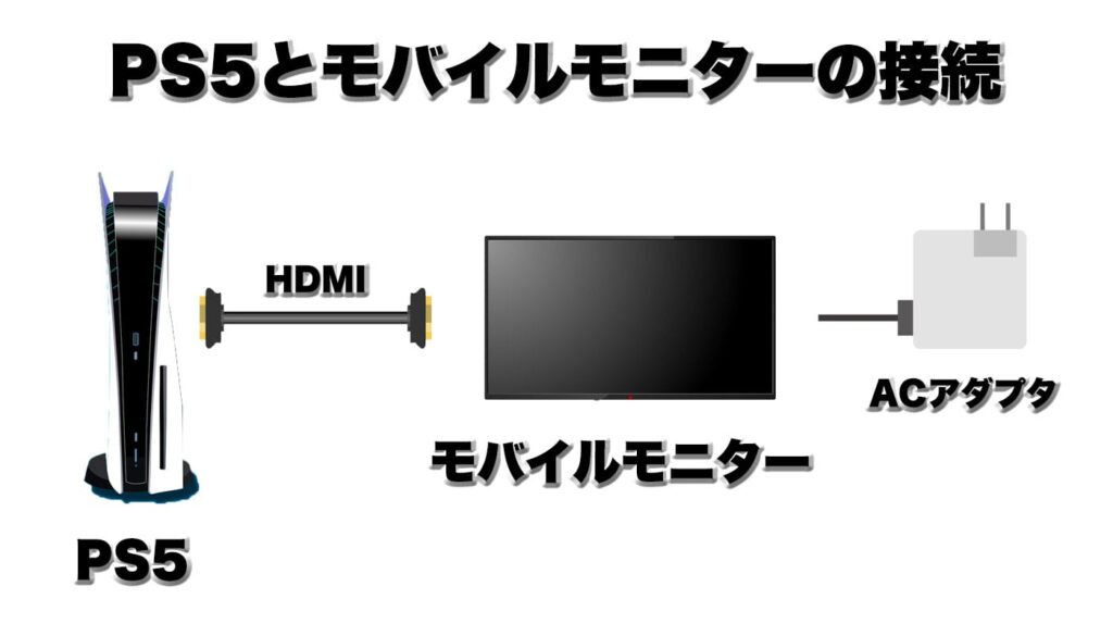 モバイルモニターに接続するのは、ACアダプターからの給電用PD端子とPS5との標準HDMI端子の2つです。