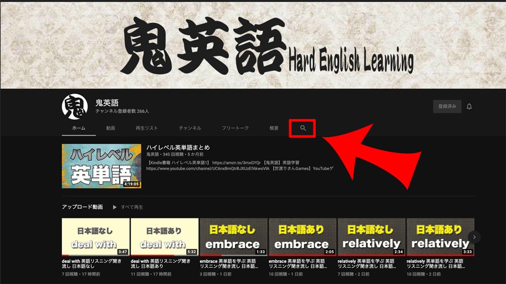 チャンネルのホーム画面を開くと、動画を検索できる検索窓が右上に表示されています。