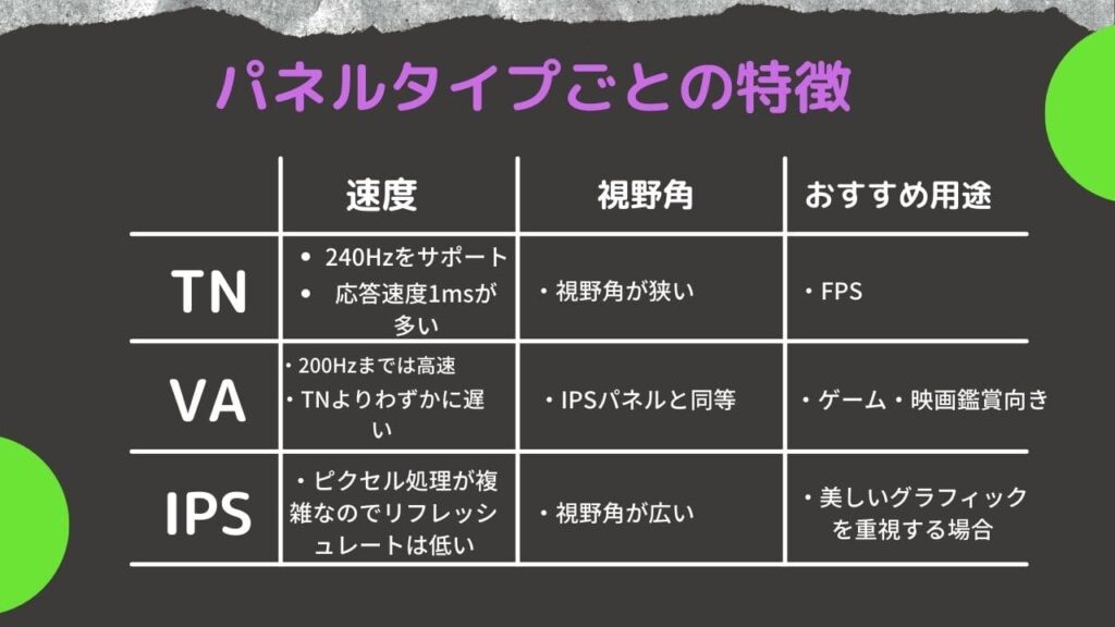 IPSパネルは視野角が広く美しいグラフィックを描写できるという特徴がありますが、リフレッシュレートや応答速度は低くなる傾向にあります。